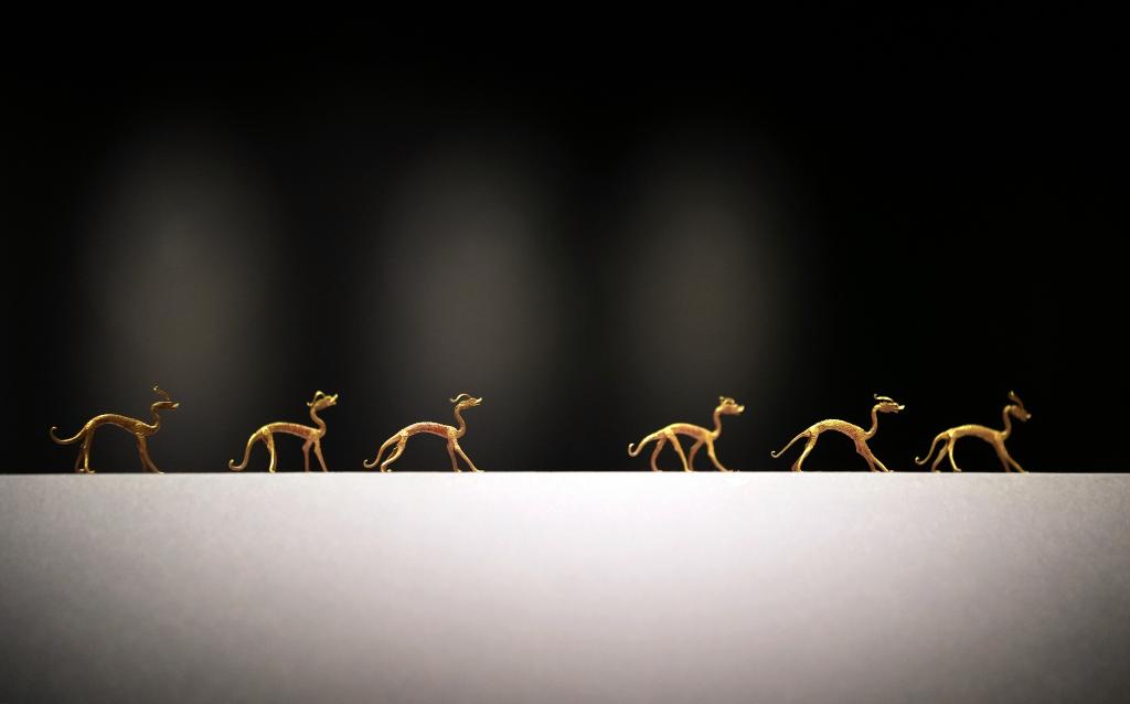 在唐人眼中,龙是吉祥瑞兽。赤金走龙打破了人们印象中“飞龙”的形象,每条金龙都有4条细直长腿,呈奔跑状。有的昂首挺胸、勇往直前,有的稍有顿足、抬头观望,体现着奋发向上的精神面貌。专家分析,它们有可能用于祭祀仪式,祈求风调雨顺、社稷平安。
