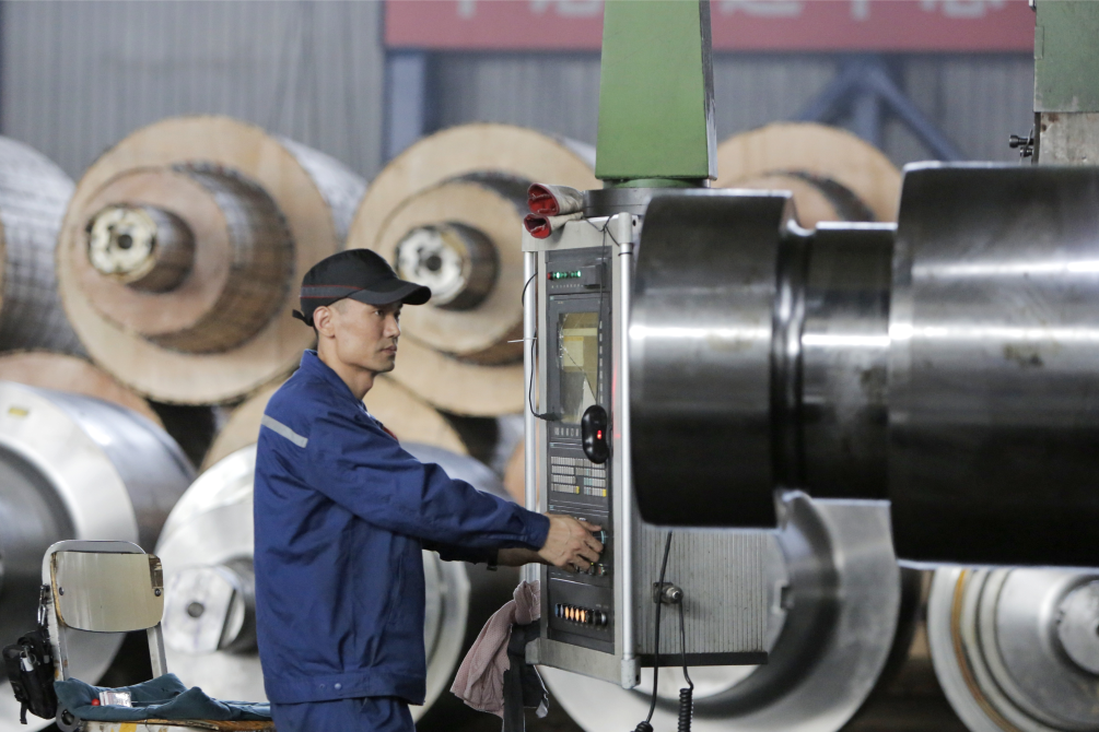 2023年4月18日,工人在位于黑龙江省齐齐哈尔市的中国一重生产车间进行生产作业。