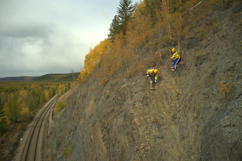 2023年9月13日,中国铁路哈尔滨局集团有限公司的铁路工人在大兴安岭地区嫩林线378公里处的山头上清理危石危树。