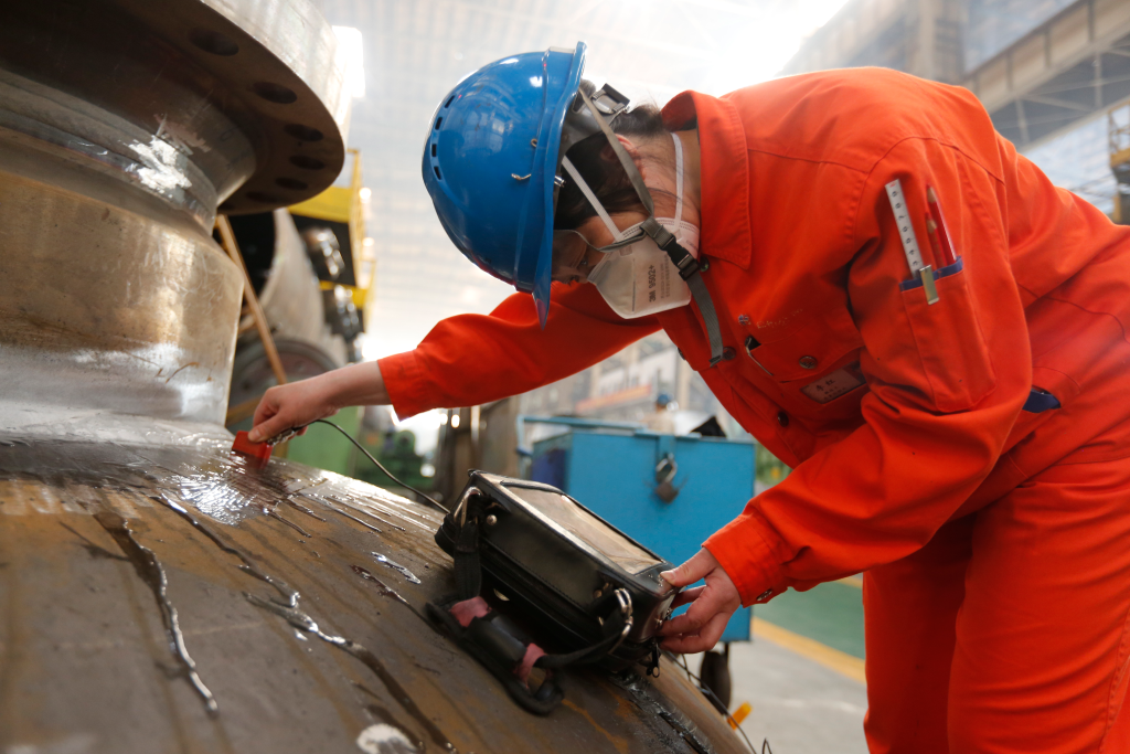 2023年3月6日,哈电集团哈尔滨锅炉厂有限责任公司探伤工李红在作业中。