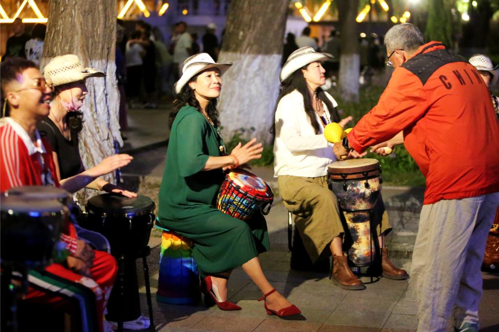 2023年8月27日,民间乐团在哈尔滨松花江畔进行乐器表演。
