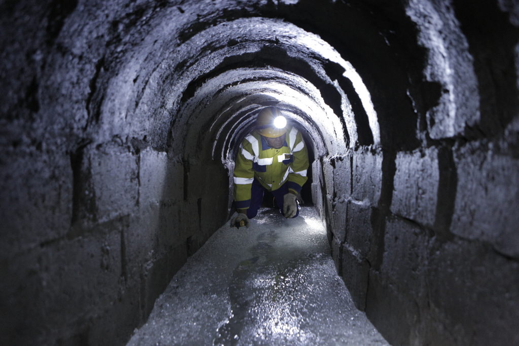 2023年9月13日,在大兴安岭地区白卡尔隧道,中国铁路哈尔滨局集团有限公司的铁路工人在地下8米的深井检查排水系统的畅通情况。
