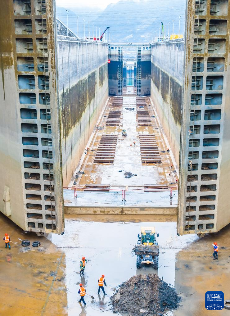 2月21日,三峡北线船闸进行检修施工(无人机照片)。新华社发(郑家裕摄)