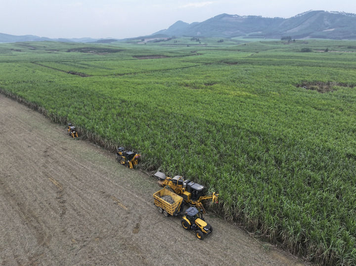 在广西来宾市国家现代农业产业园黄安优质“双高”糖料蔗基地,农民驾驶农机收割甘蔗(无人机照片)。新华社记者 周华 摄