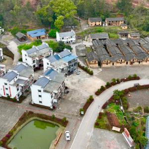 一边是66套白墙黛瓦的客家新楼,另一边是7栋土坯老屋。