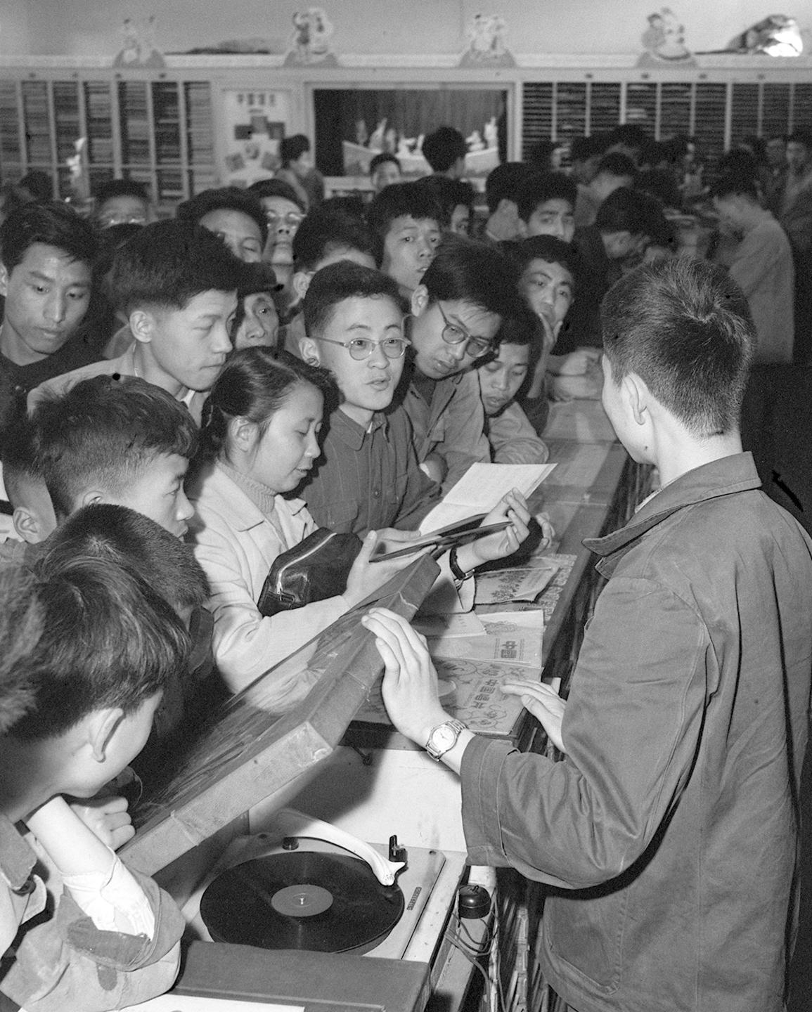 1964年,上海音乐书店唱片柜台前,站满了选购歌曲唱片的人群。