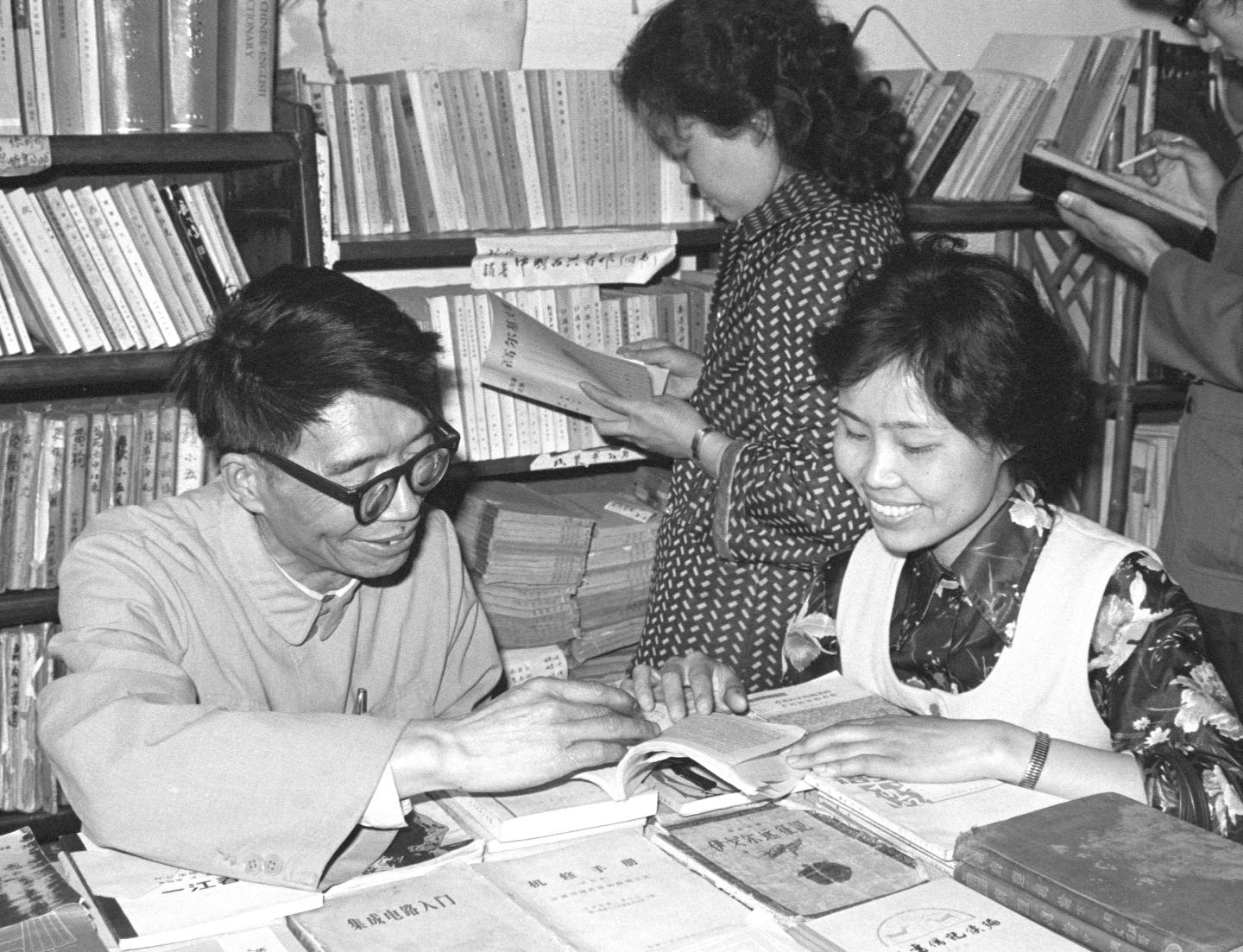 1983年,成都市个体户刘应泉(左)向成都市芷泉百货商店经理廖金蓉(右)推荐通俗经济理论书籍。刘应泉经营旧书店,热心为读者选购、征购、托售书籍。