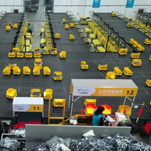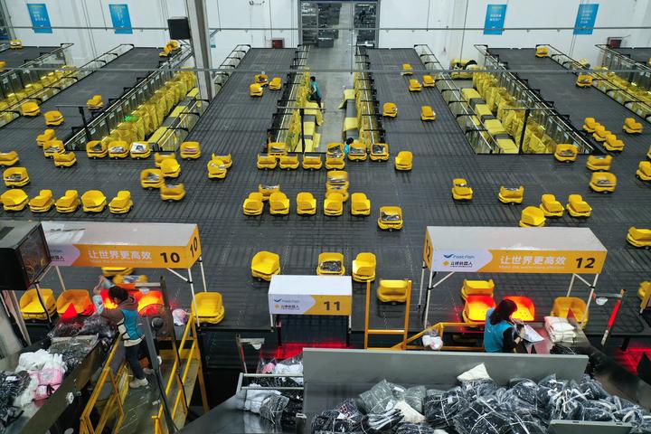 德清县乾元镇一家服装企业的物流中心,分拣机器人在配送服饰。新华社发(倪立芳摄)