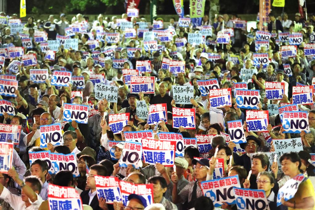 2018年9月19日,在日本东京,民众手持标语参加反对新安保法集会。新华社记者杜潇逸摄