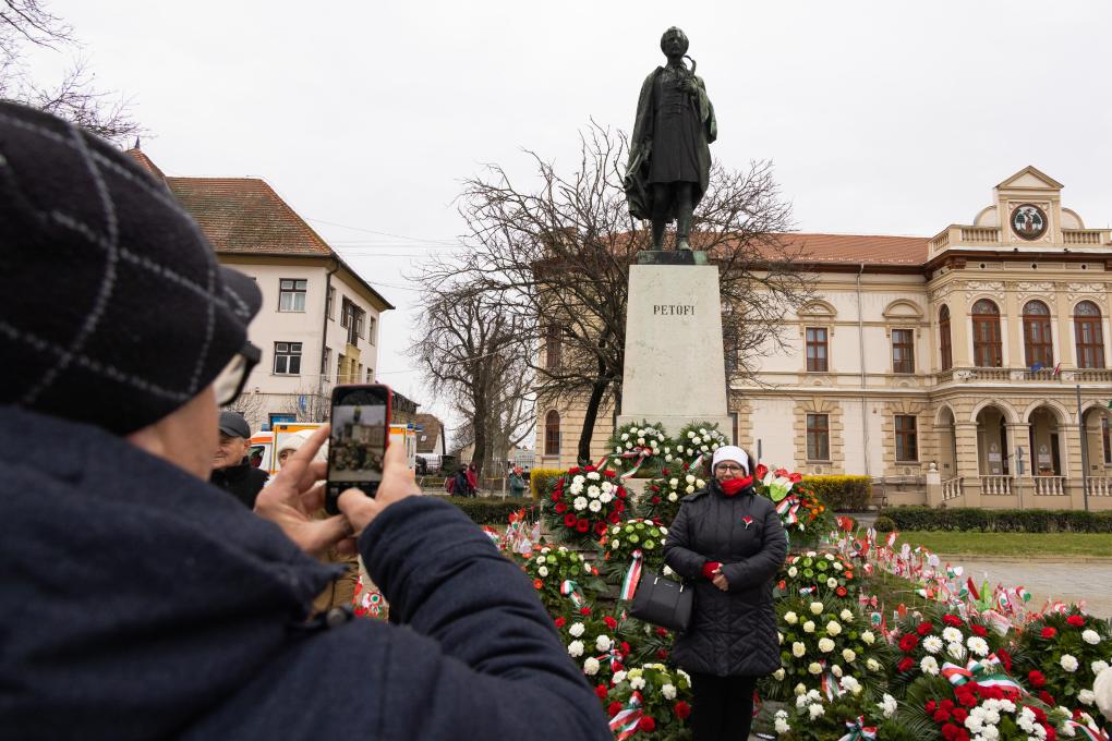 2023年3月15日,匈牙利首都布达佩斯和裴多菲出生地小克勒什举行庆祝活动,纪念1848年革命和自由斗争175周年。图为民众当日在小克勒什的裴多菲雕像前拍照留念。新华社发(弗尔季·奥蒂洛摄)