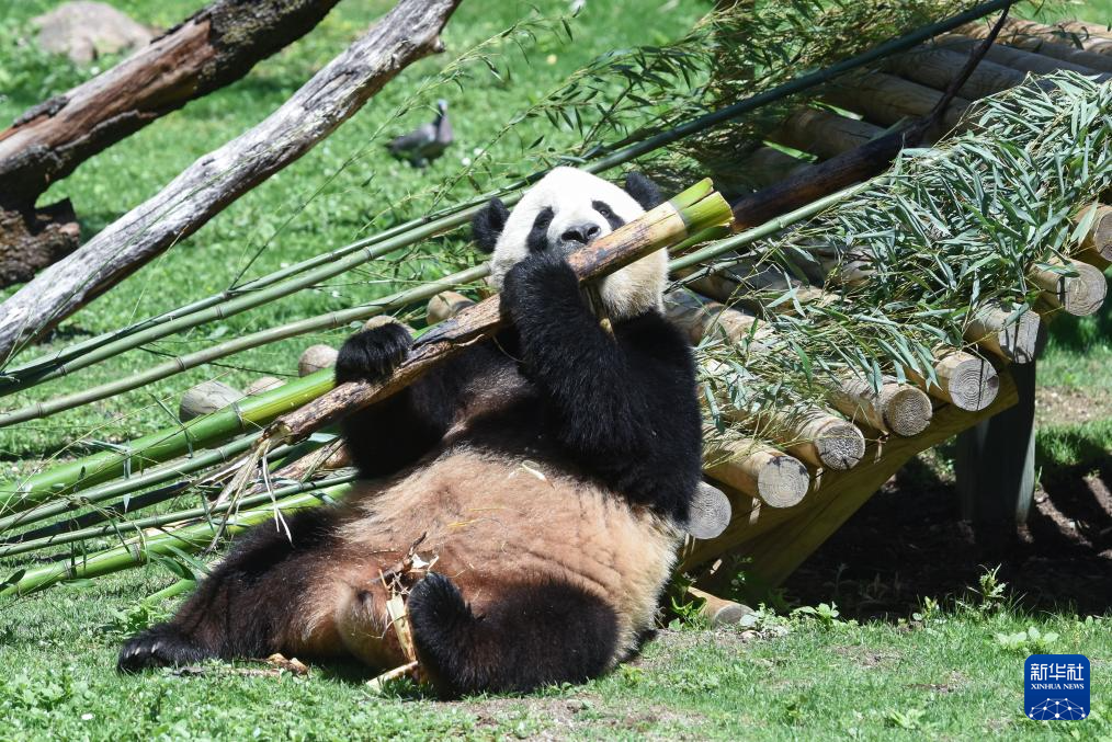 5月30日,大熊猫“茱萸”在西班牙马德里动物园吃竹子。新华社发(古斯塔沃·巴连特摄)