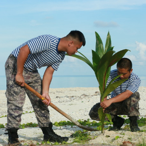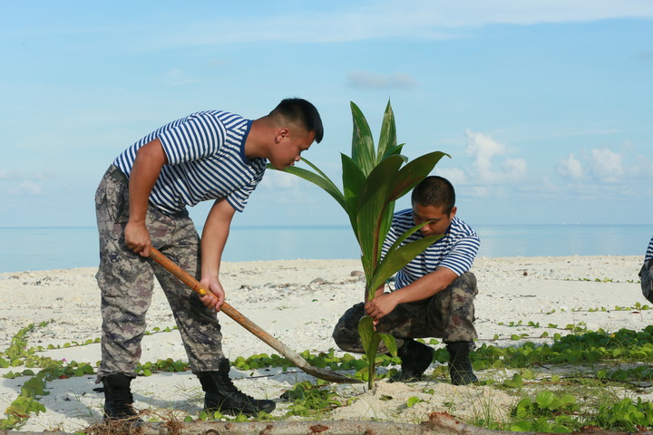 西沙官兵正在种植树苗。新华社发(钟鑫 摄)