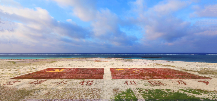 中建岛官兵种植海马草,铺成党旗、国旗的形状。一代代西沙官兵秉承“把岛礁当家建,把守岛当事业千”的豪迈暂言,如一座座蓝色丰碑,日夜守护着这“海上花园。(钟剑 摄)