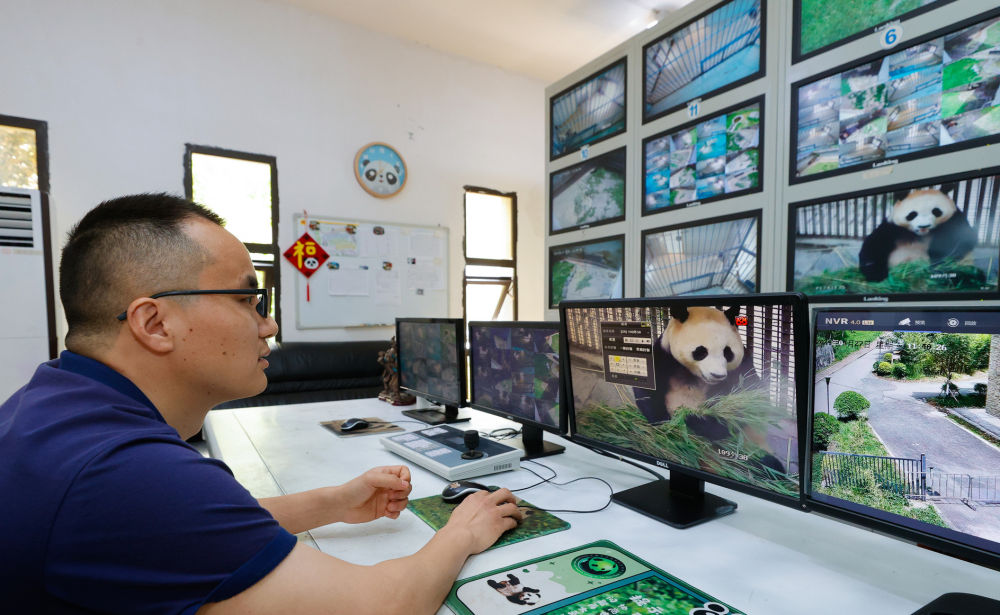 ↑5月27日,在中国大熊猫保护研究中心卧龙神树坪基地的监控室,“福宝”的饲养员徐翔通过监控观察“福宝”吃竹子的情况。