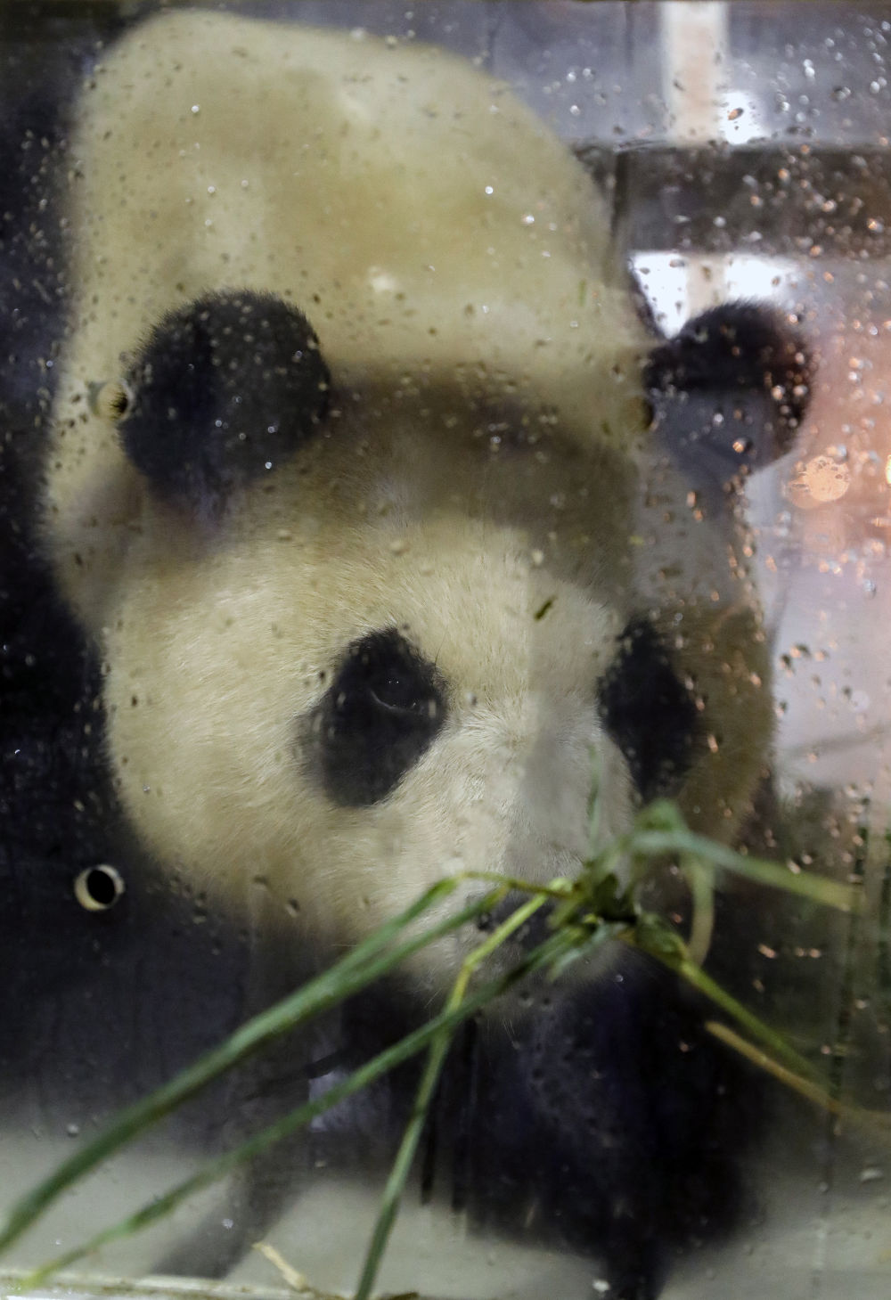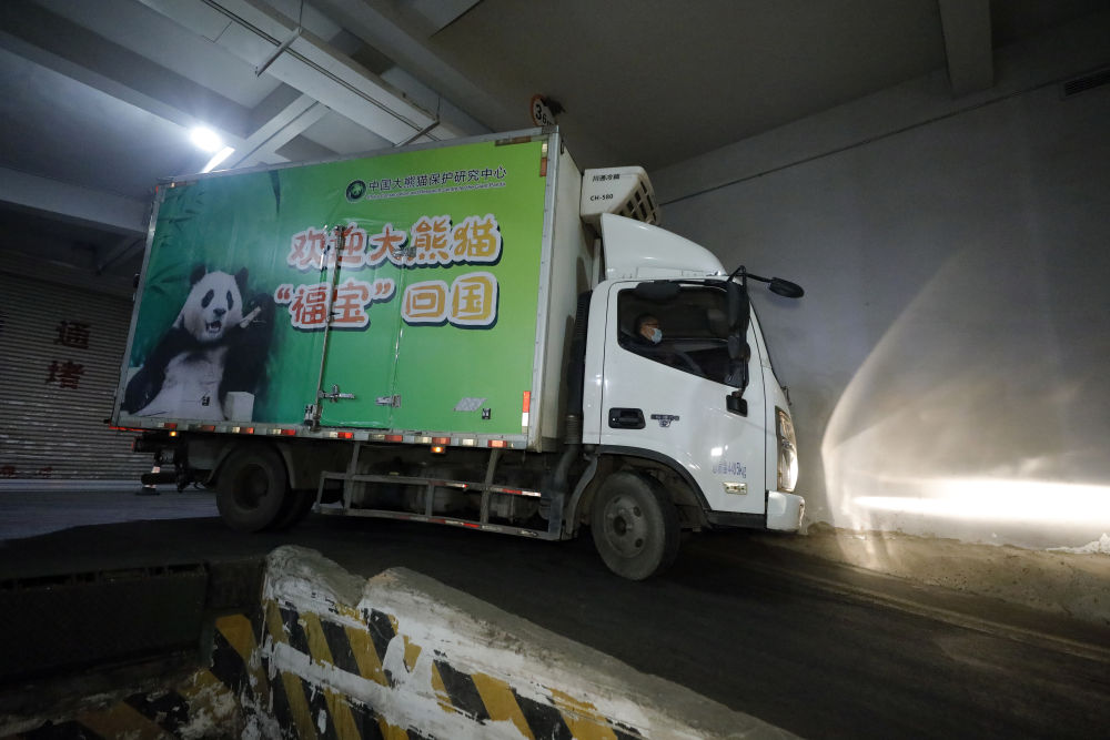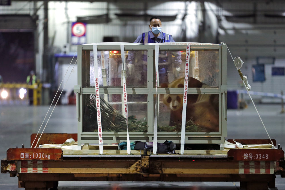 ↑4月3日,旅韩大熊猫“福宝”搭乘包机抵达成都双流国际机场。