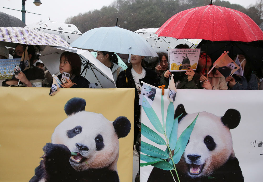 ↑4月3日,韩国民众雨中送别旅韩大熊猫“福宝”。