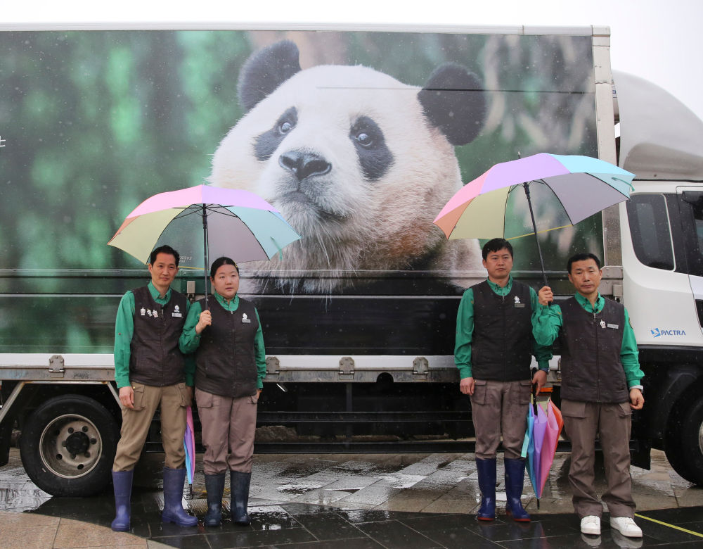 ↑4月3日,启程出发前,“福宝”韩国饲养员团体与装载“福宝”的车辆合影。