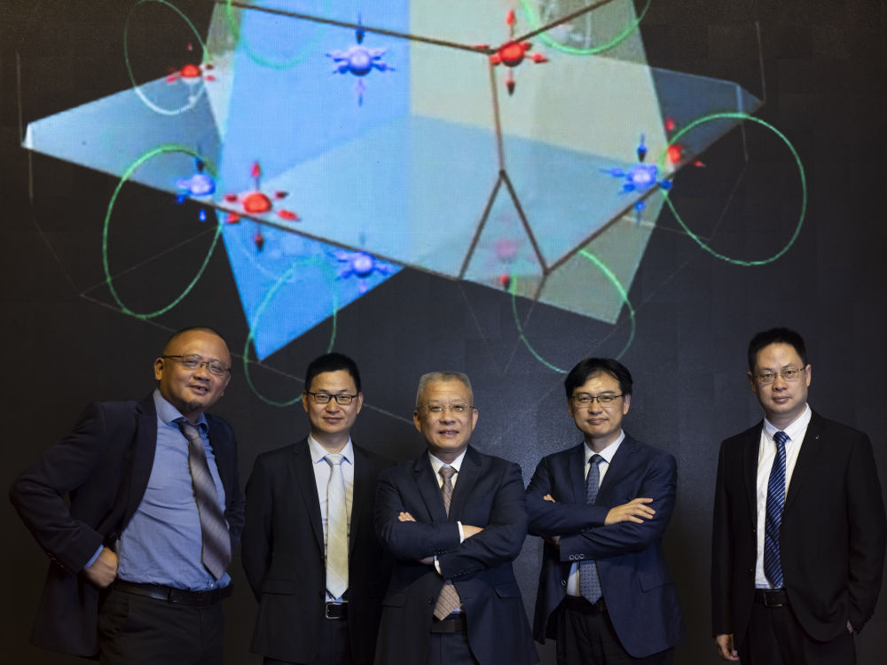6月22日,方忠(中)和团队成员戴希(左一)、王志俊(左二)、翁红明(右二)、余睿(右一)在中国科学院物理研究所拍摄合影。