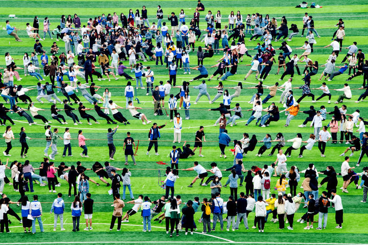 湖北经济学院学生们在操场上参加拔河比赛。杨宏斌 摄