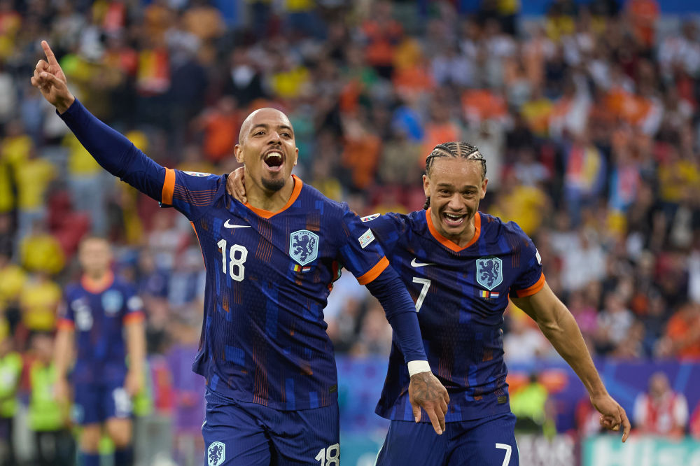 7月2日,荷兰队球员马伦(左)在比赛中庆祝进球。新华社记者 孟鼎博 摄