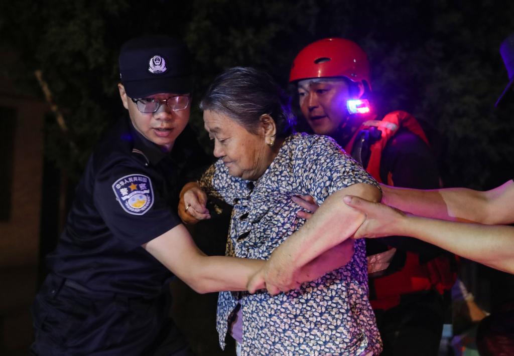 7月29日,辽宁出入境边防检查总站丹东边境管理支队一经街边境派出所民警(左)将被困群众向安全地区转移。新华社发