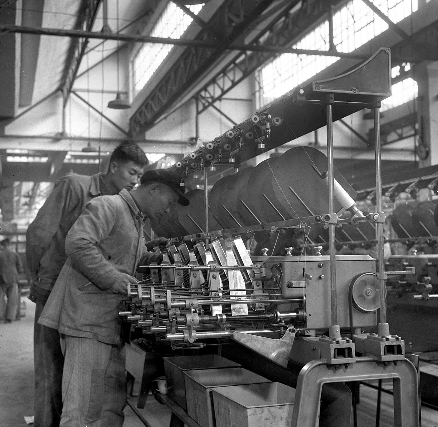 1965年,经纬纺织机械厂工人在装配长丝纺丝机。