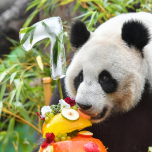 在庆生活动现场,“丁丁”入场后先用鼻子嗅来嗅去,再围着自己的新“家具”转了几圈,试用了一下竹筒水杯,而后才开始享用自己的“生日蛋糕”。蛋糕由苹果、葡萄等水果制成,插着数字“7”形状的冰块。与谨慎的“丁丁”不同,“如意”刚一入场便“横冲直撞”,先是拆开了“烤炉”,然后又奔向放在旁边的“生日蛋糕”,津津有味地吃起来。