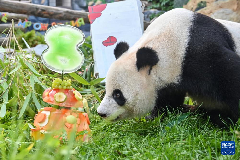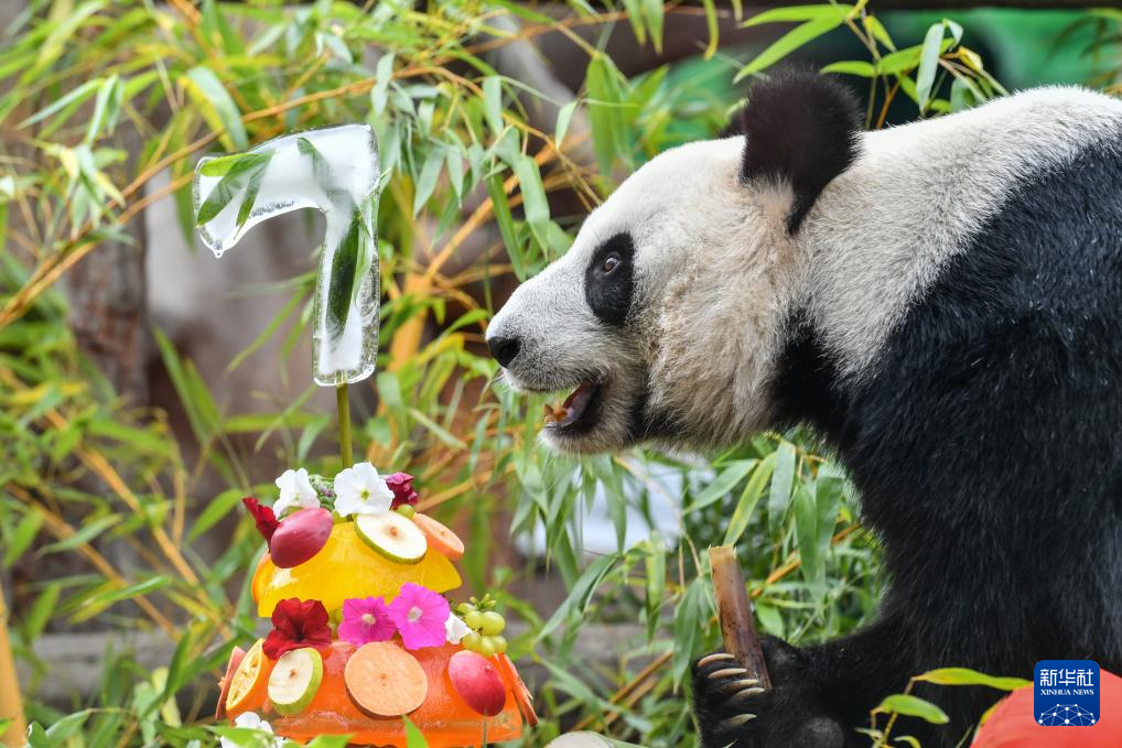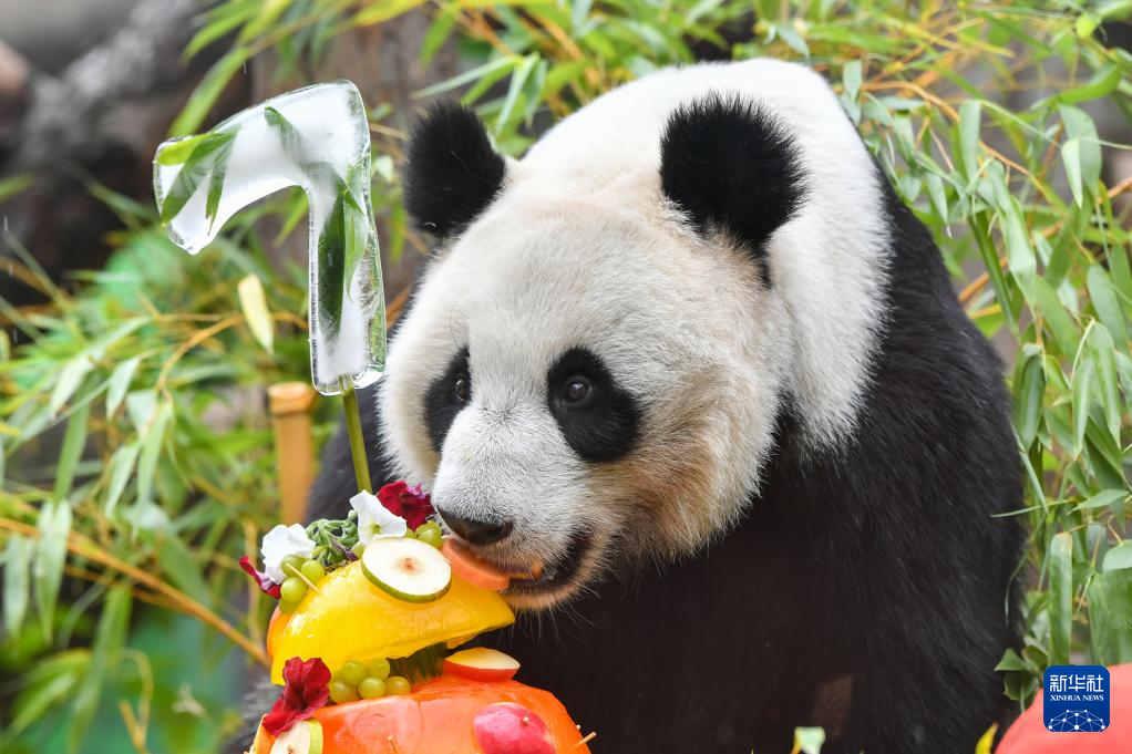 7月30日,在俄罗斯莫斯科动物园,大熊猫“丁丁”享用生日大餐。当日,莫斯科动物园为来自中国的大熊猫“丁丁”庆祝生日。雌性大熊猫“丁丁”2017年7月30日出生于中国四川卧龙神树坪基地,它和大熊猫“如意”于2019年4月29日抵达莫斯科,开启为期15年的旅居生活。新华社记者 曹阳 摄