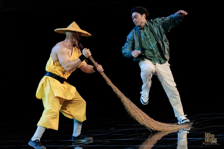 来自英国的“扫地僧”白龙与演员樊少皇共同演绎李小龙黄色战衣前世传奇。《国家宝藏》供图