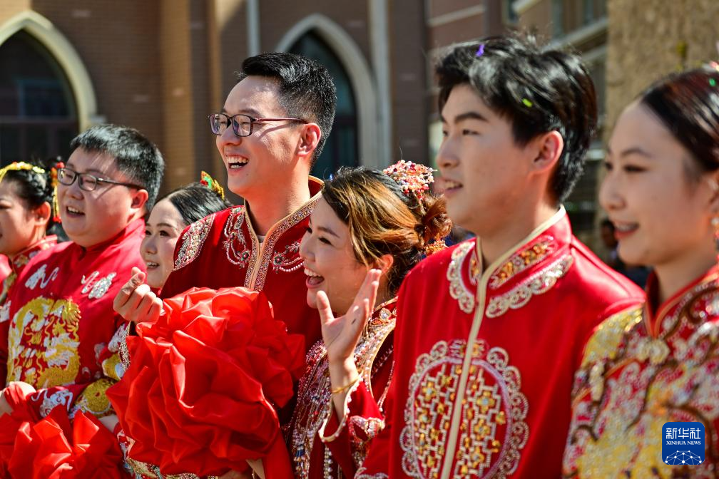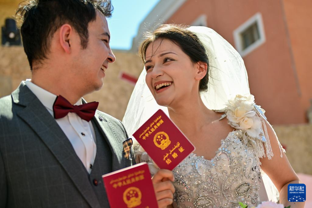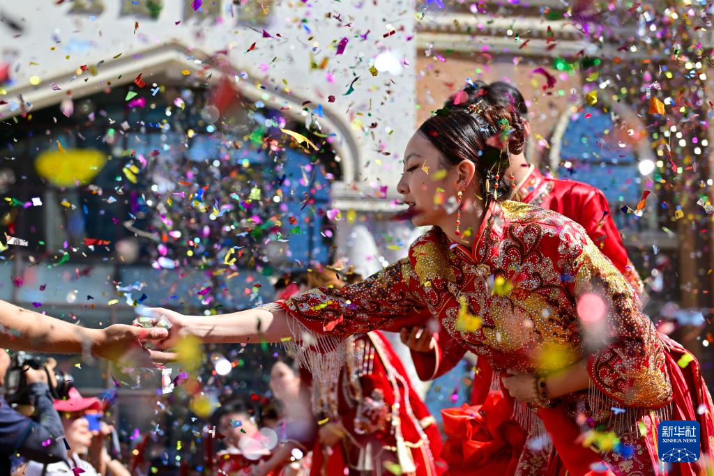 当日是七夕佳节,来自新疆乌鲁木齐市天山区的10对新人在新疆国际大巴扎街区举办集体婚礼,浪漫、欢乐且充满文化韵味的节日氛围吸引众多市民和游客。