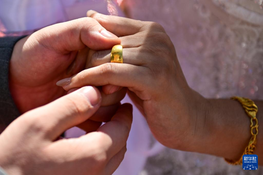 8月10日,在新疆国际大巴扎街区,参加婚礼的新人在仪式上交换戒指。