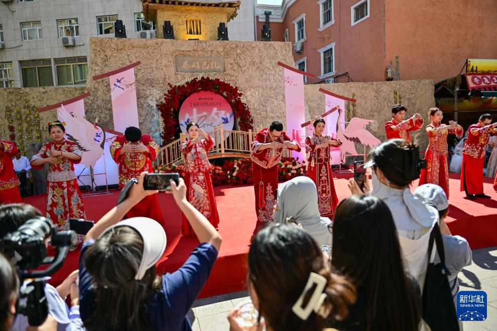 8月10日,一对新人参加在新疆国际大巴扎街区举行的传统中式婚礼。