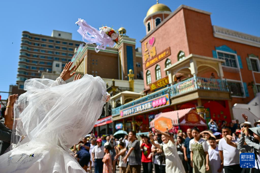 8月10日,在新疆国际大巴扎街区,参加婚礼的新人抛捧花。