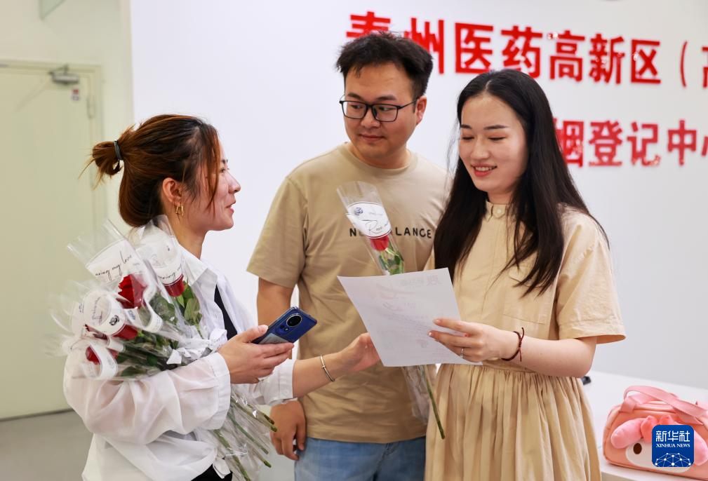 8月10日,在江苏省泰州医药高新区(高港区)婚姻登记中心,工作人员给前来登记结婚的新人送上一枝玫瑰。