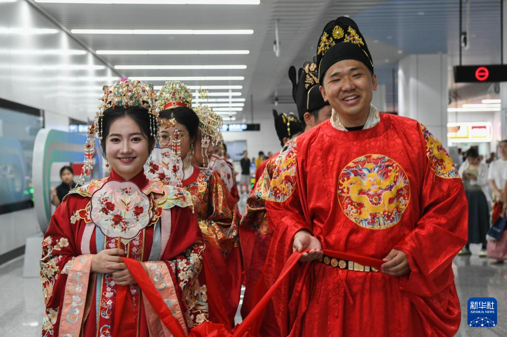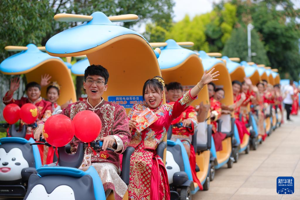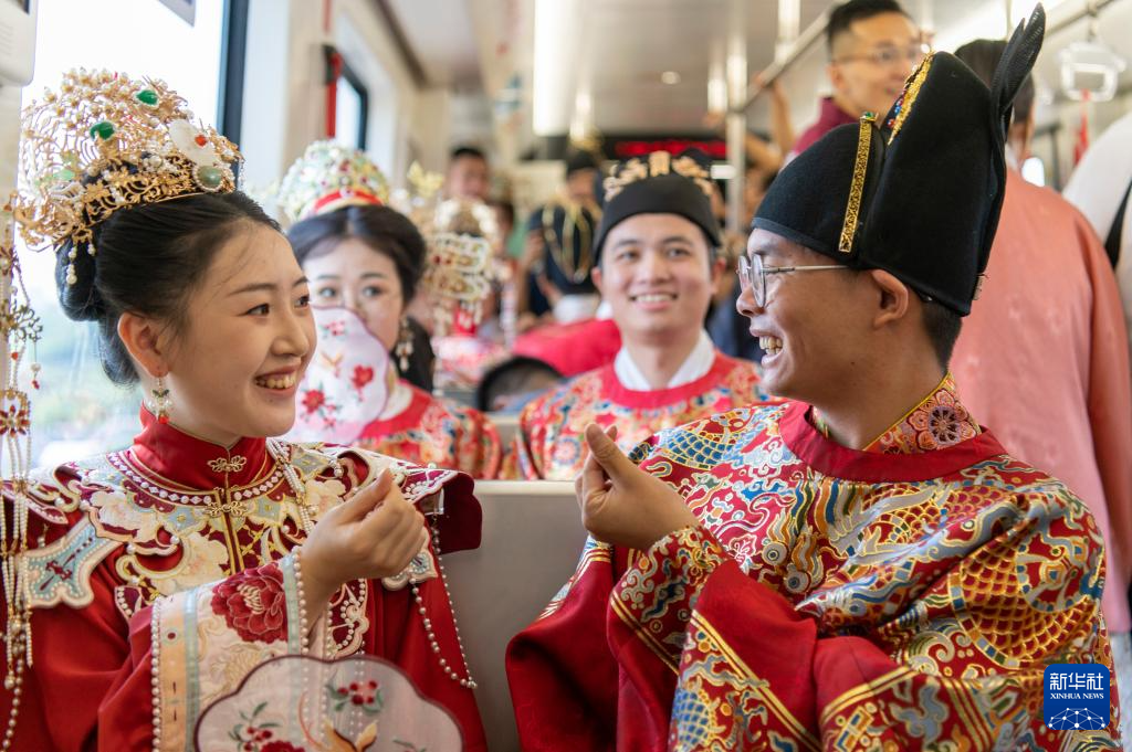 8月10日,新人参加由浙江省金华市民政局与金华市轨道交通集团有限公司联合举办的“缘起金轨、爱在七夕”集体婚礼。
