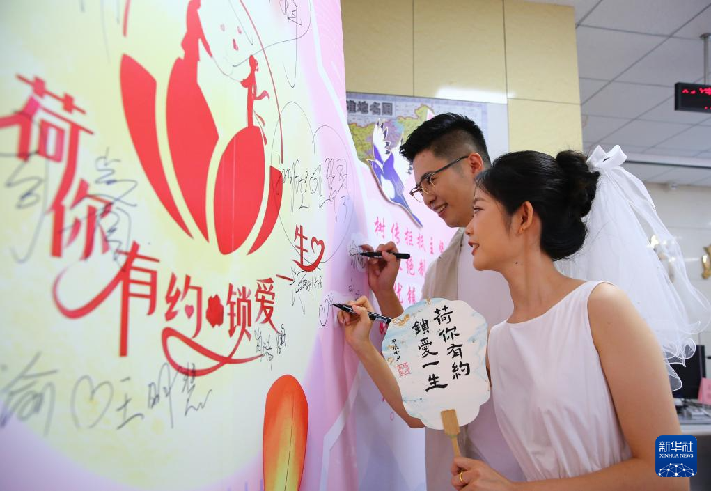 8月10日,一对新人在山东省滕州市民政局婚姻登记处的爱心墙上签名。
