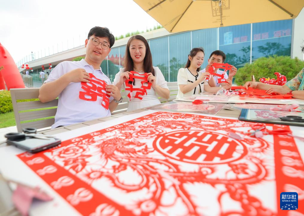 8月10日,在山东省荣成市樱花湖体育公园户外婚姻登记巡回点,新人们在剪纸。