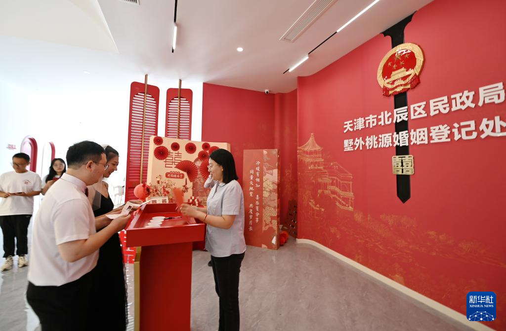8月10日,在天津市北辰区民政局墅外桃源婚姻登记处,工作人员为新人颁证。