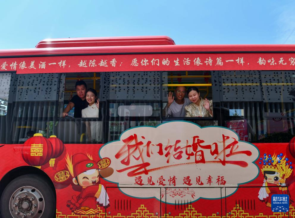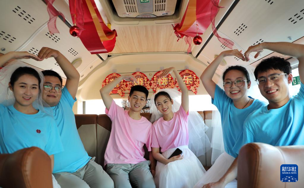 8月10日,在山东省邹平市,新人乘坐“幸福号”公交婚车前往婚姻登记喜悦巡回点办理结婚登记。