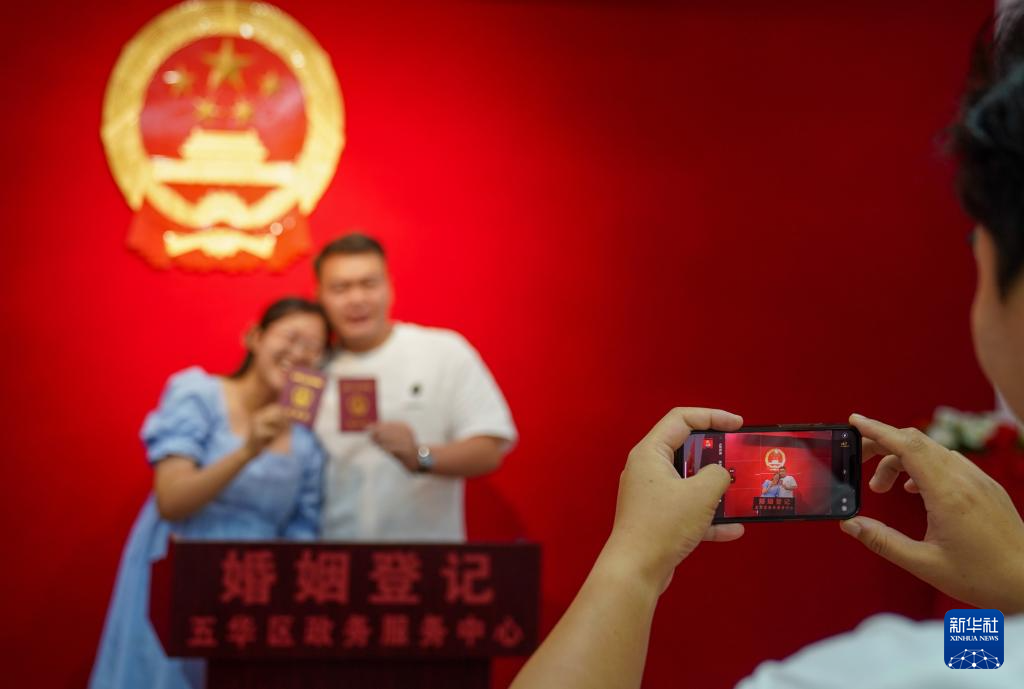8月10日,在云南省昆明市五华区政务服务中心,一对新人领取结婚证后拍照留念。