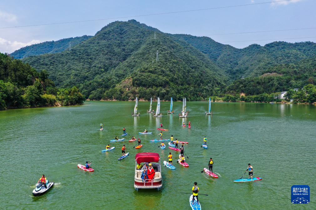 8月10日,在千岛湖面上,桨板运动爱好者以桨板水上迎亲的方式将水上运动与传统民俗相结合,为单身青年男女打造浪漫独特的交友及文化体验平台。