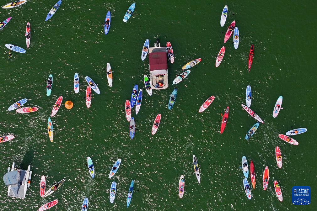 8月10日,在千岛湖面上,桨板运动爱好者以桨板水上迎亲的方式将水上运动与传统民俗相结合,为单身青年男女打造浪漫独特的交友及文化体验平台(无人机照片)。