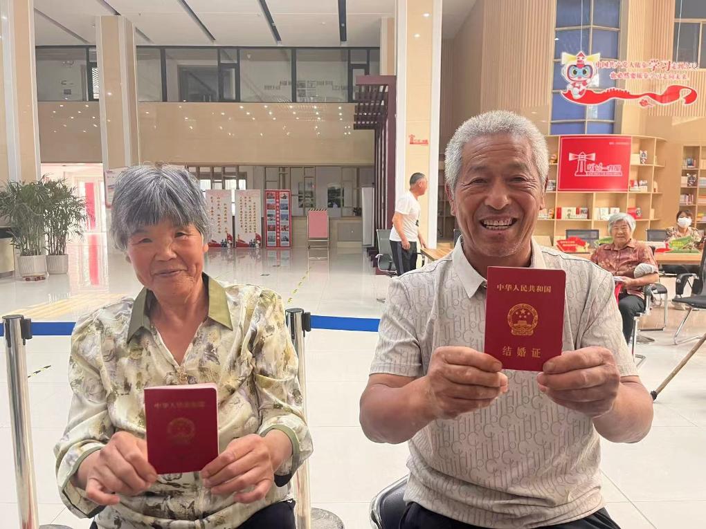 在山东东营广饶县稻庄镇便民服务中心大厅,老人刚刚拿到补办的结婚证。(受访单位供图)
