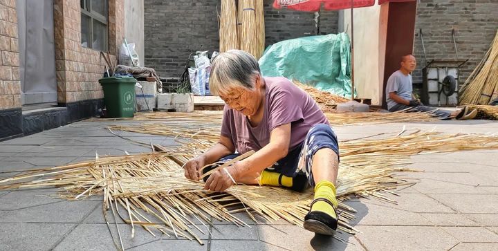 转眼到了中午,太阳高挂。在一户庭院前,记者看到几个刚编好的苇席整齐摆放,有大有小。进了门去,一对老夫妇正坐在院子里编席。