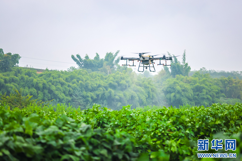 无人机在自贡市贡井区成佳镇五四村的大豆田进行喷洒农药作业。新华网发(宋姿熠 摄)