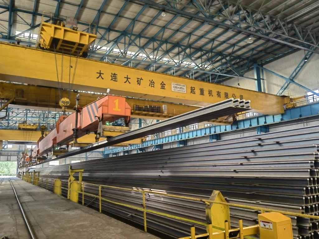 图为包钢轨梁厂百米钢轨吊车正在吊装钢轨。新华社发