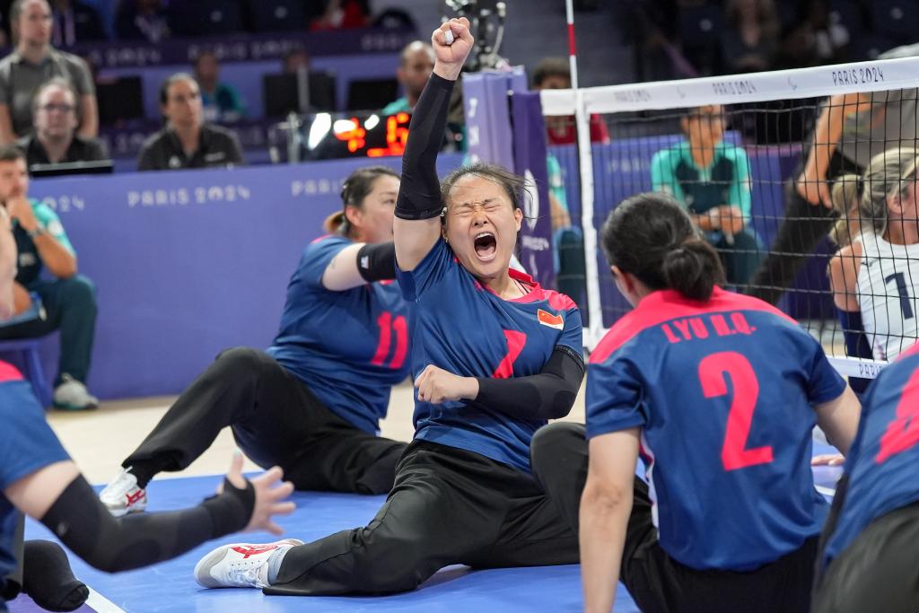 9月7日,中国队球员王亚男(中)在巴黎残奥会女子坐式排球决赛中。新华社记者 张铖 摄