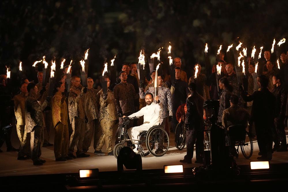 8月28日,火炬手热雷米亚(中)在巴黎残奥会开幕式上传递火炬。新华社记者 熊琦 摄