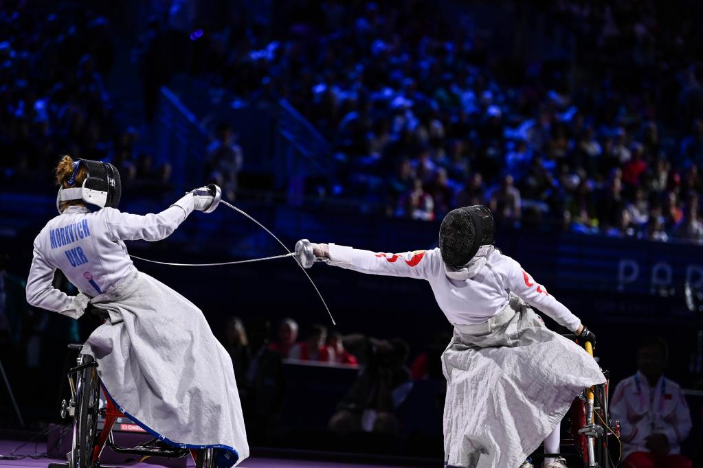 9月7日,中国队选手邹绪凤(右)与乌克兰队选手纳塔利娅在巴黎残奥会女子重剑团体赛决赛中。新华社记者 张豪夫 摄