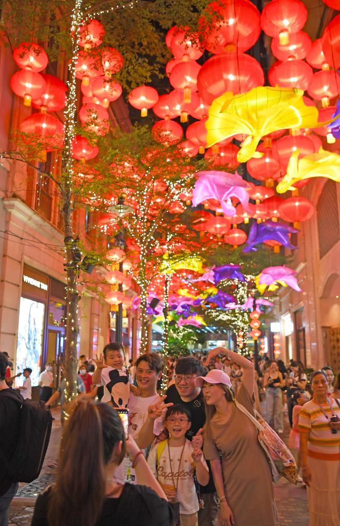 在坚尼地城卑路乍湾海滨长廊,5个不同特色的灯笼主题区在此设立,包括传统的杨桃灯笼、新式的绸缎布料印花灯笼和环保手作灯笼等,组成一片“灯笼天空”。此外,现场还设置多个摊位,涵盖特色美食、文创潮玩等,为市民开启一场中秋奇妙游园会。